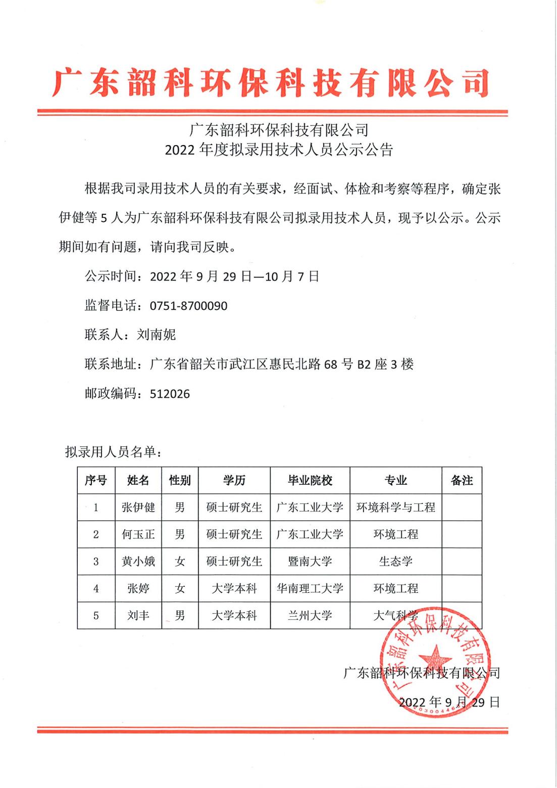根據我司錄用技術人員的有關要求,經面試、體檢和考察等程序,確定張伊健等5人為廣東韶科環保科技有限公司擬錄用技術人員,現予以公示。公示期間如有問題,請向我司反映。